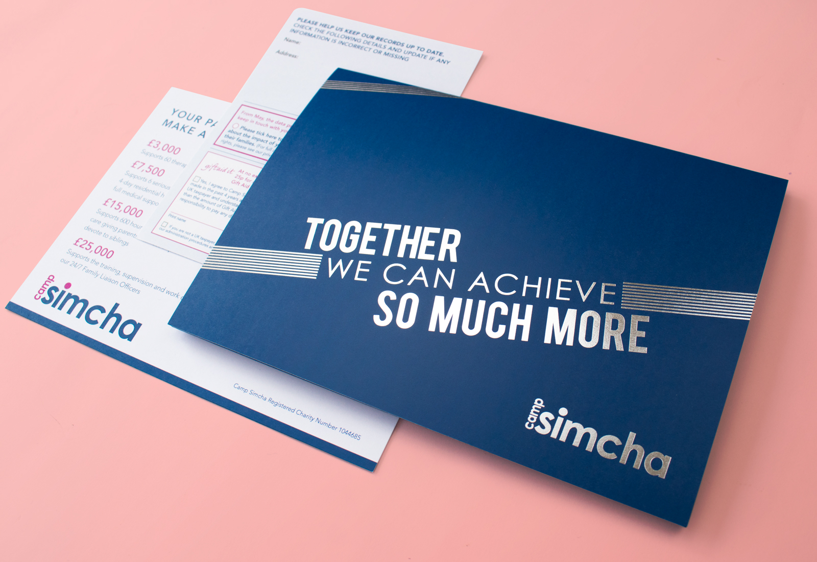 We designed this quality postal appeal to encourage people to become a Camp Simcha Patron. Patrons donate money to help the children’s charity raise vital funds for services for families with sick children.